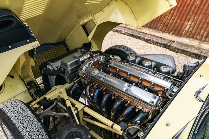 The E-type was back on the road in March 2009, having had no expense spared in terms of its restoration. It was then kept in a cocoon in a garage, and a photographic record of the rebuild comes with the car.